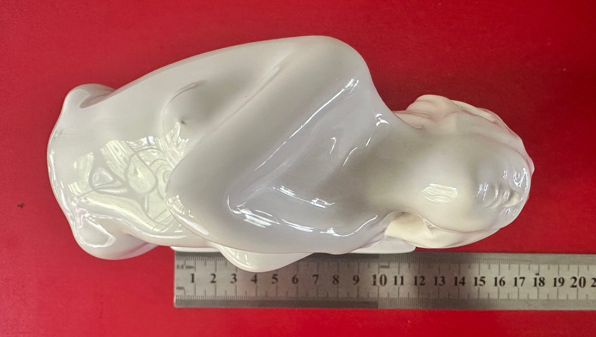 Photos and video simply cannot describe the beauty of this lady. This exquisite porcelain statuette captures the timeless allure of the art deco era with stunning precision. Crafted, with meticulous attention to detail, it features a graceful lady, in a captivating pose as she arches backwards, embodying the spirit of beauty and elegance.
