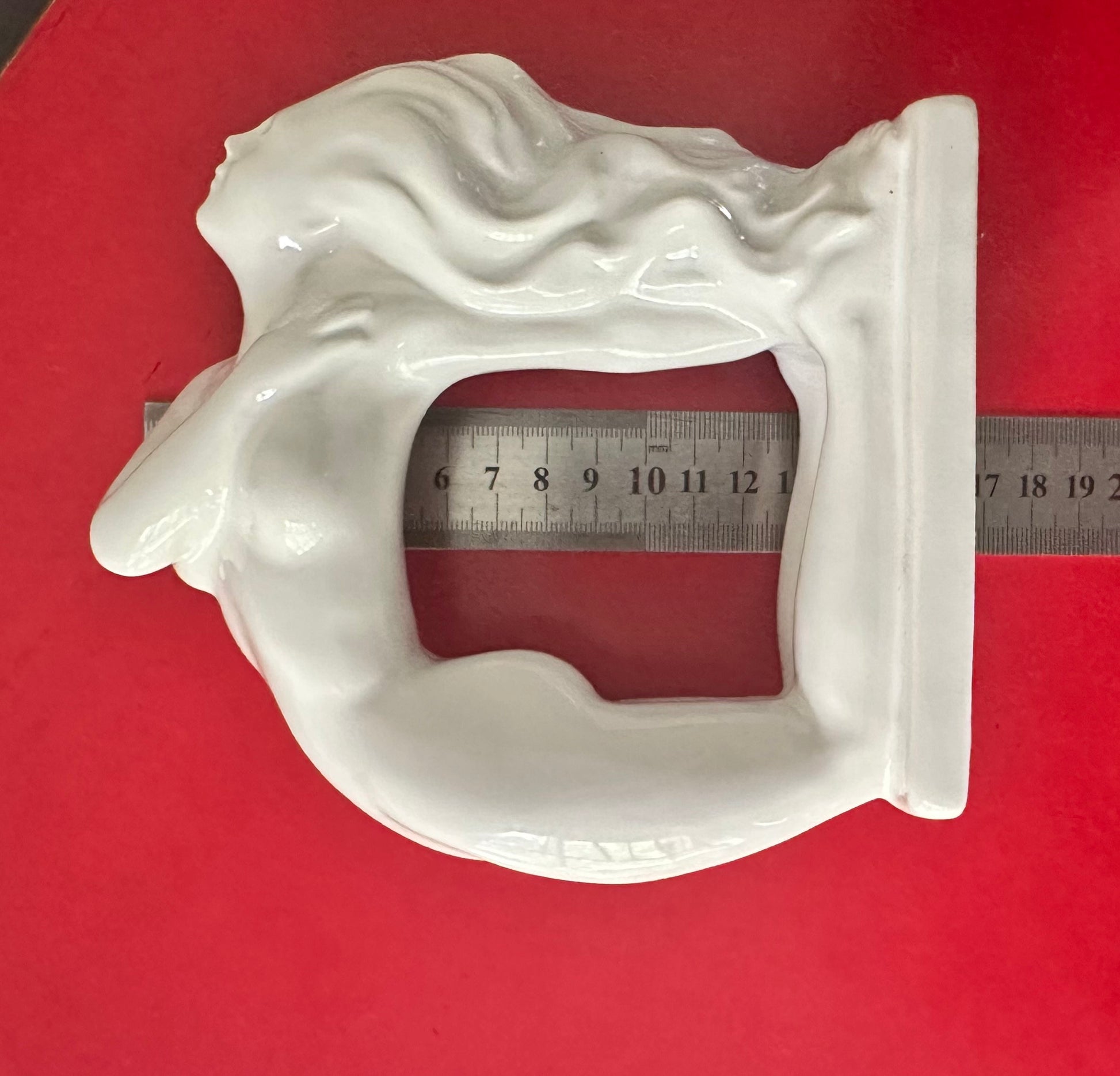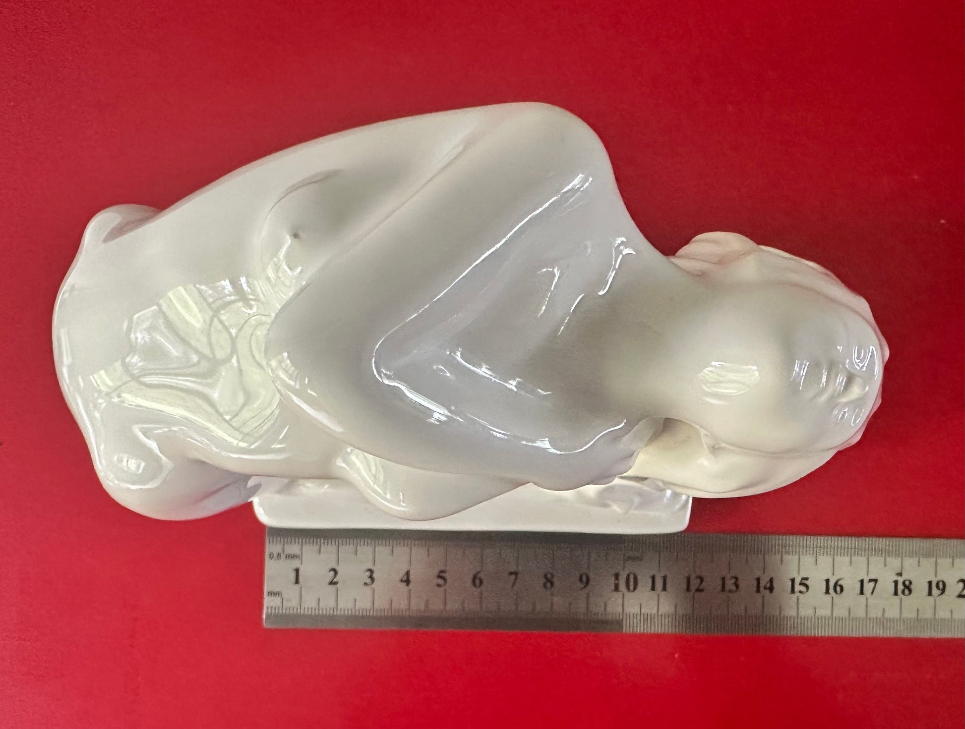 Crafted from high-quality porcelain, it exudes a sense of luxury and sophistication– each delicate detail is expertly rendered making this piece. A true work of art. Dimensions are shown with ruler in photos. Don’t miss the opportunity to own one of these stunning, art deco porcelain statuettes. Part of the deceased estate of very well respected antiquities importer, therefore it is truly limited stock .