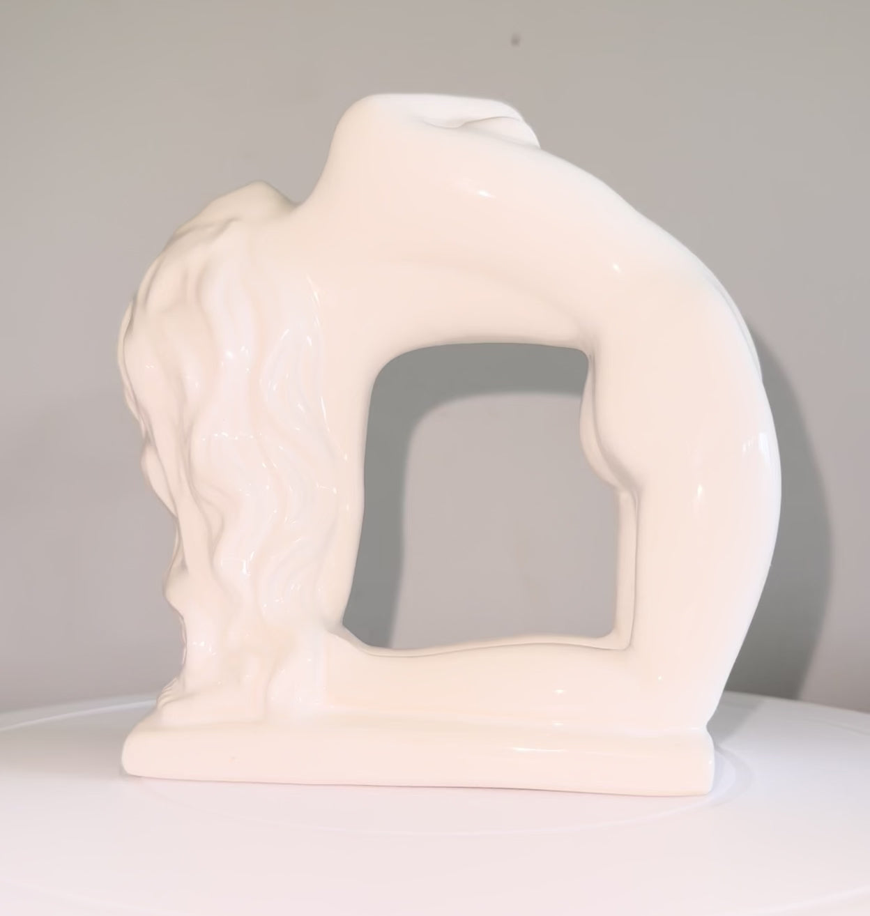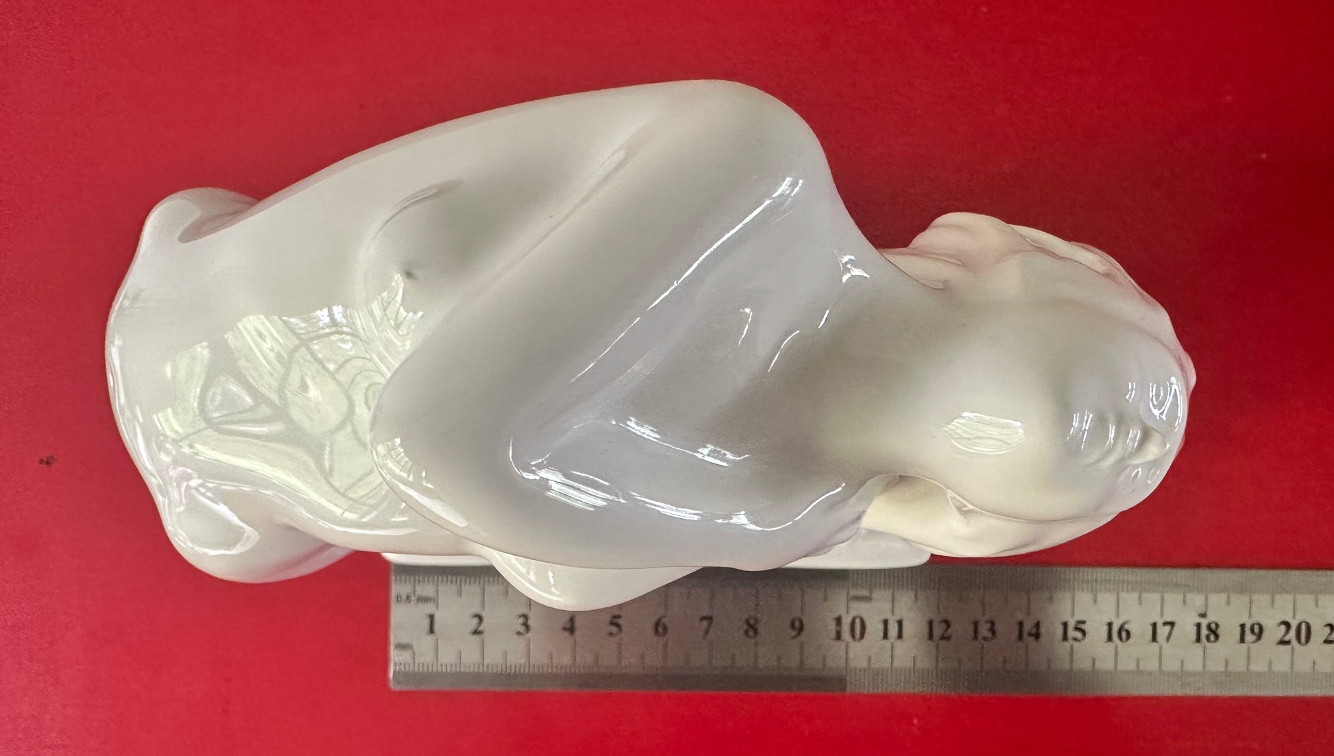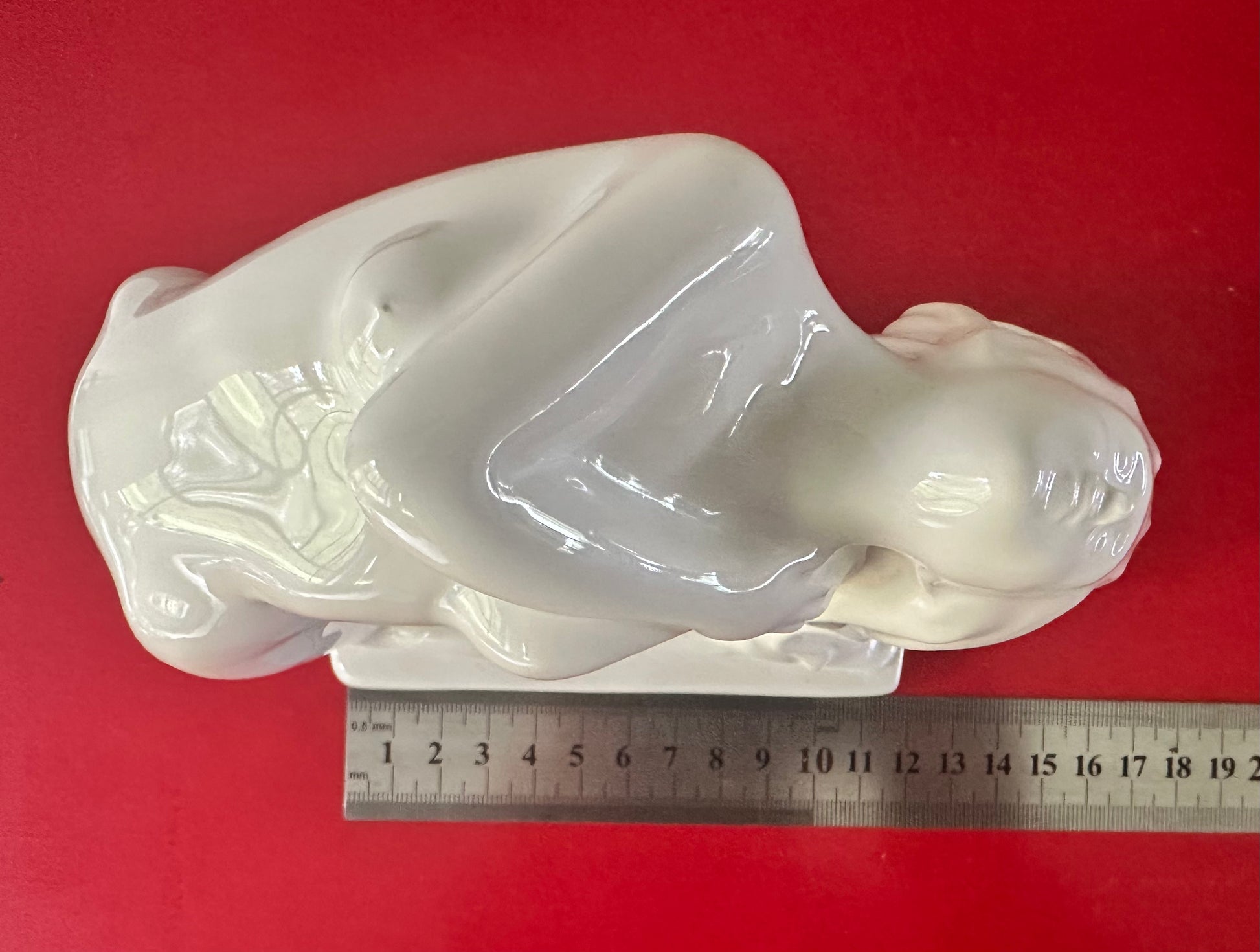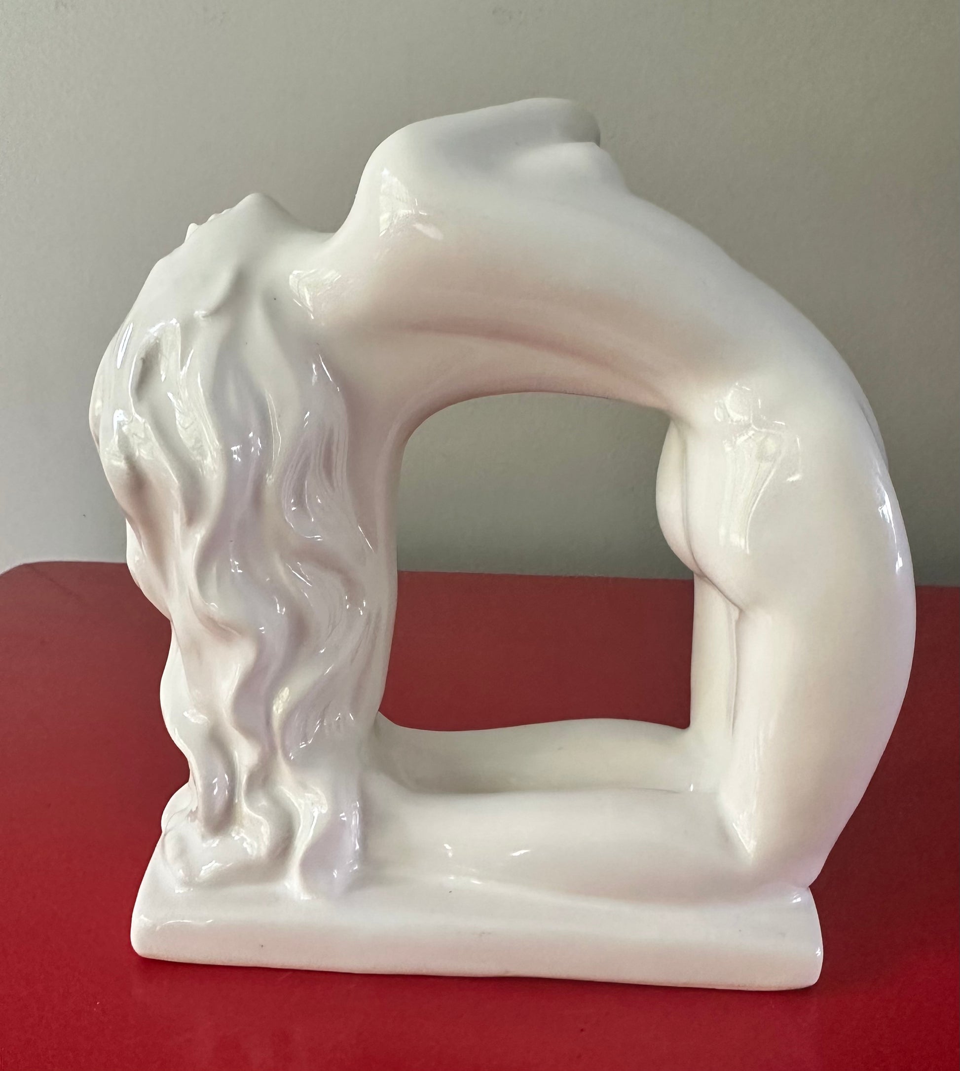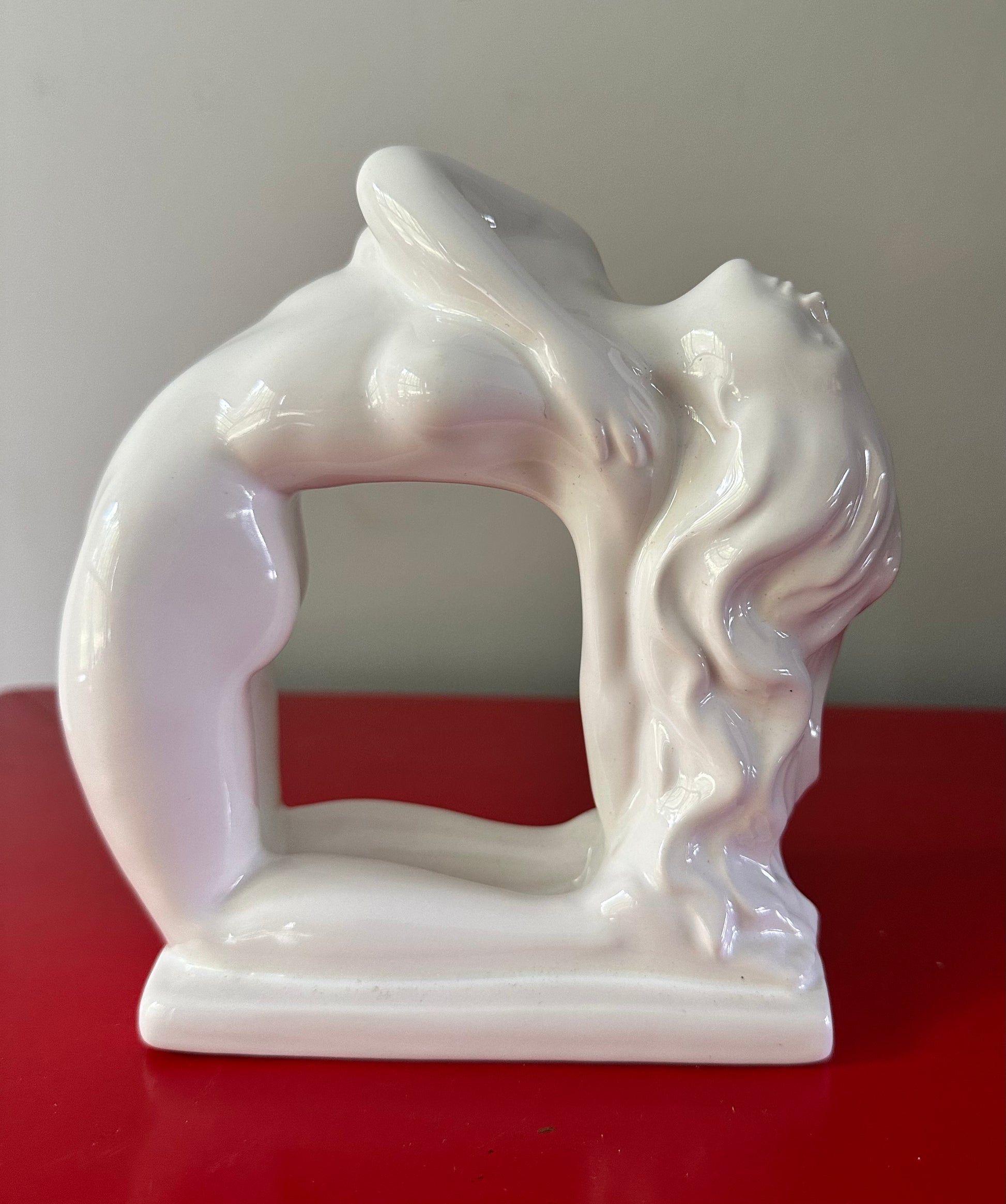 This exquisite porcelain statuette captures the timeless allure of the art deco era with stunning precision. Crafted, with meticulous attention to detail, it features a graceful lady, in a captivating pose as she arches backwards, embodying the spirit of beauty and elegance.