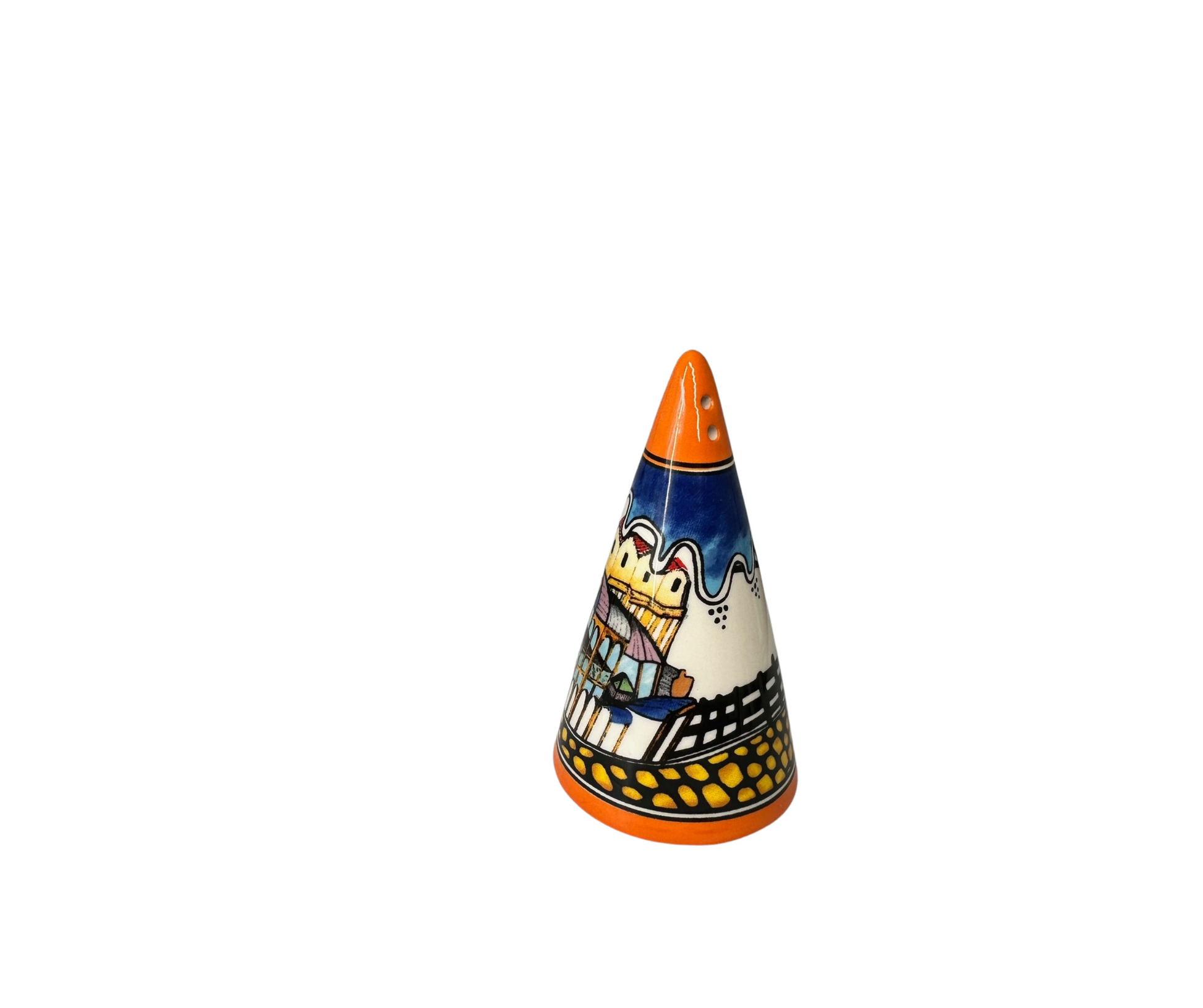 Elevate your vintage kitchen collection with this beautiful conical-shaped sifter, inspired by Art Deco and Clarice Cliff style pottery. From the NooroMason collection this sifter also has matching larger sifter, plates, tea pot, and tall cups available.