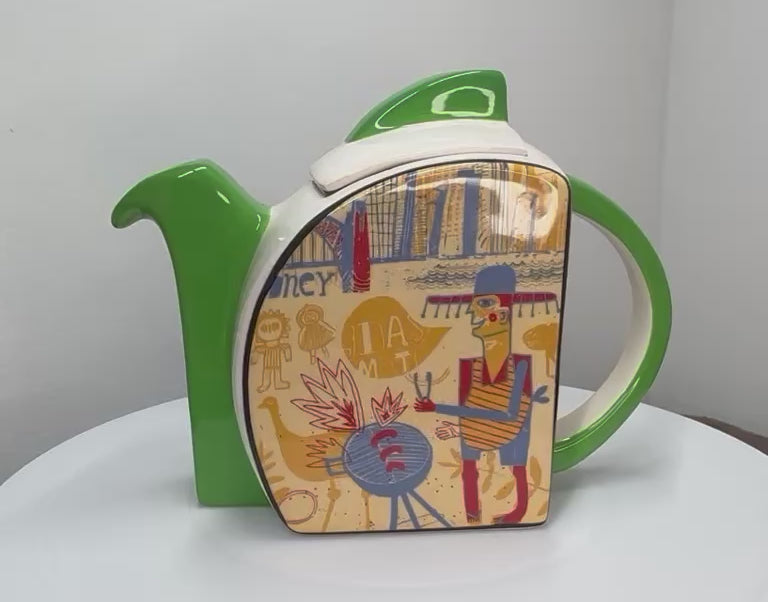 Bring the spirit of the Aussie outback to your tea table with our 🌵 Aussie BBQ Fiesta Teapot! This flat-sided teapot, perfectly sized for 2 cups, boasts a whimsical Aztec-inspired design featuring an Australian scene complete with a BBQ, capturing the essence of a lively fiesta down under.  A definative nod to the vivid colour work of Clarice Cliff.Â