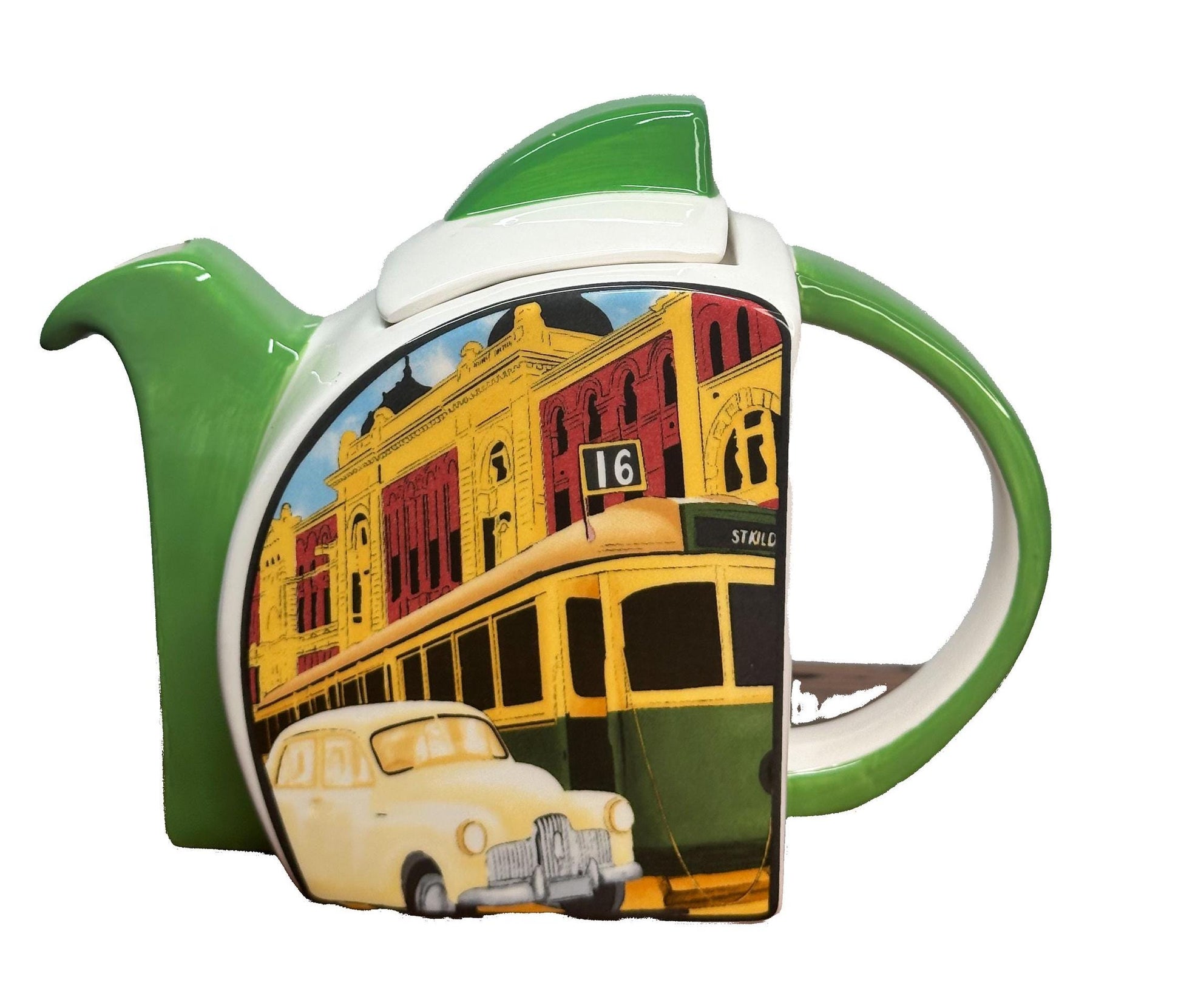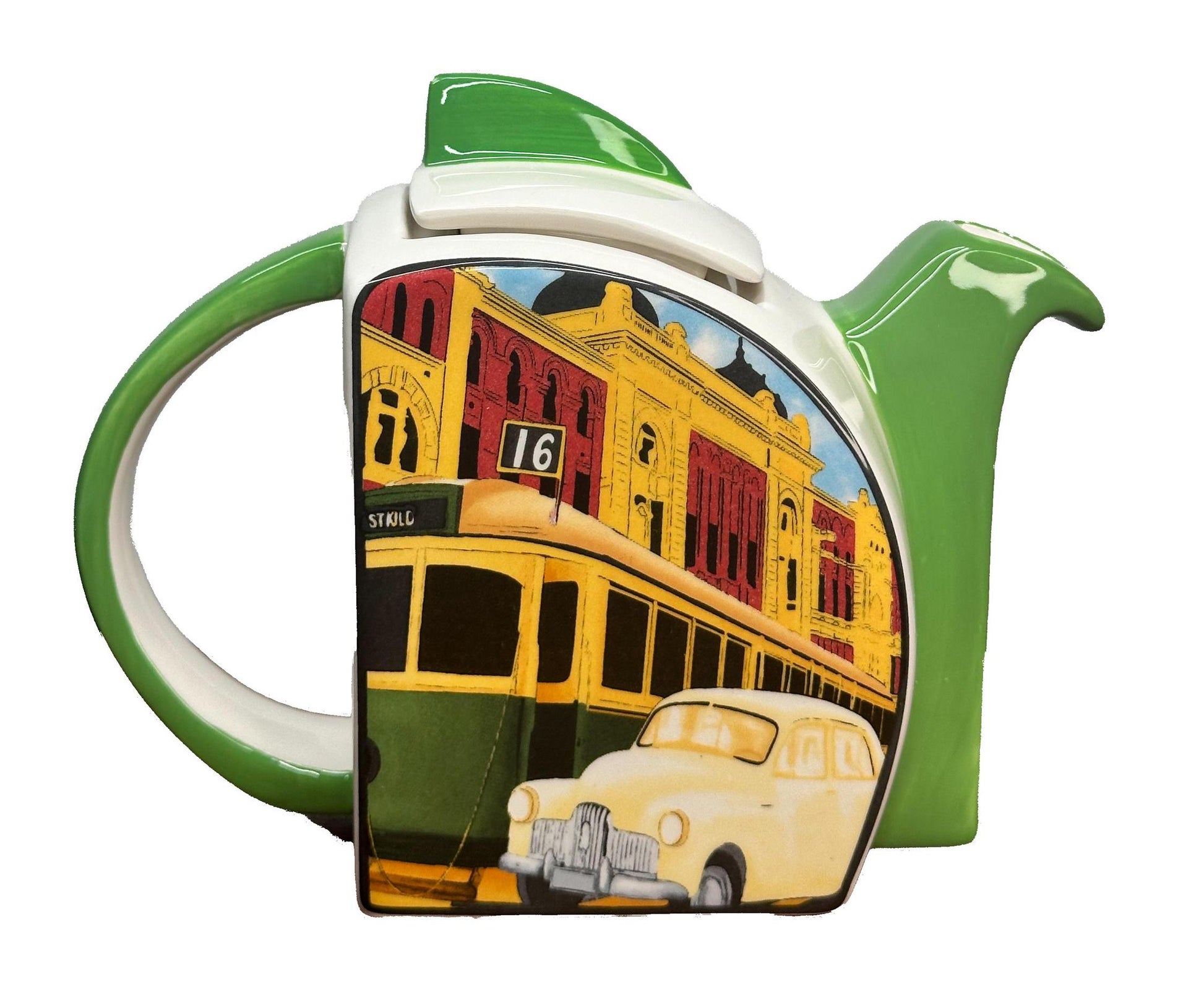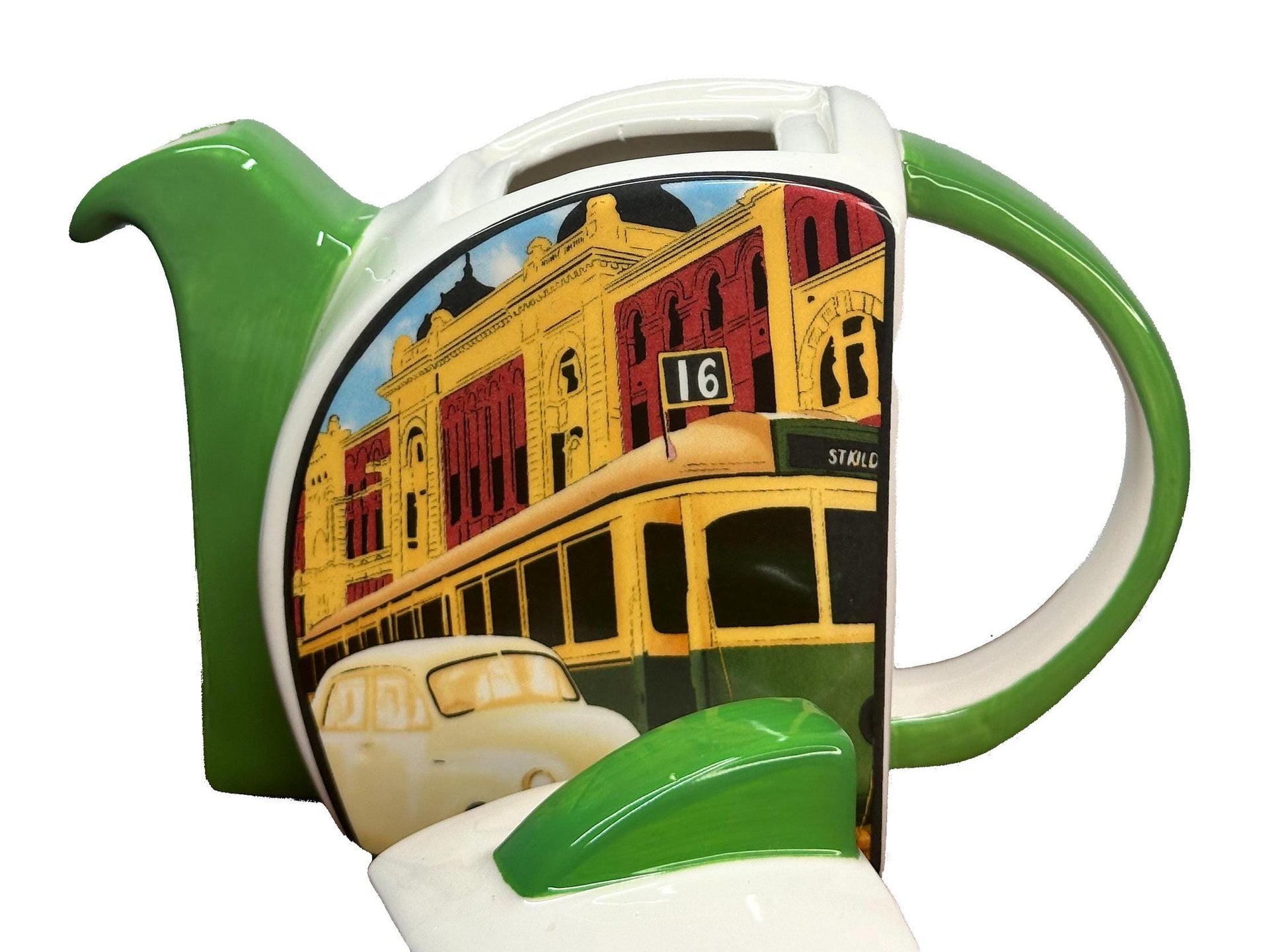 Journey through time with this hand painted teapot featuring a yesteryear Melbourne streetscape - Melbourne streetscape, vintage car, and iconic St Kilda tram. Clarice Cliff-inspired brilliance!