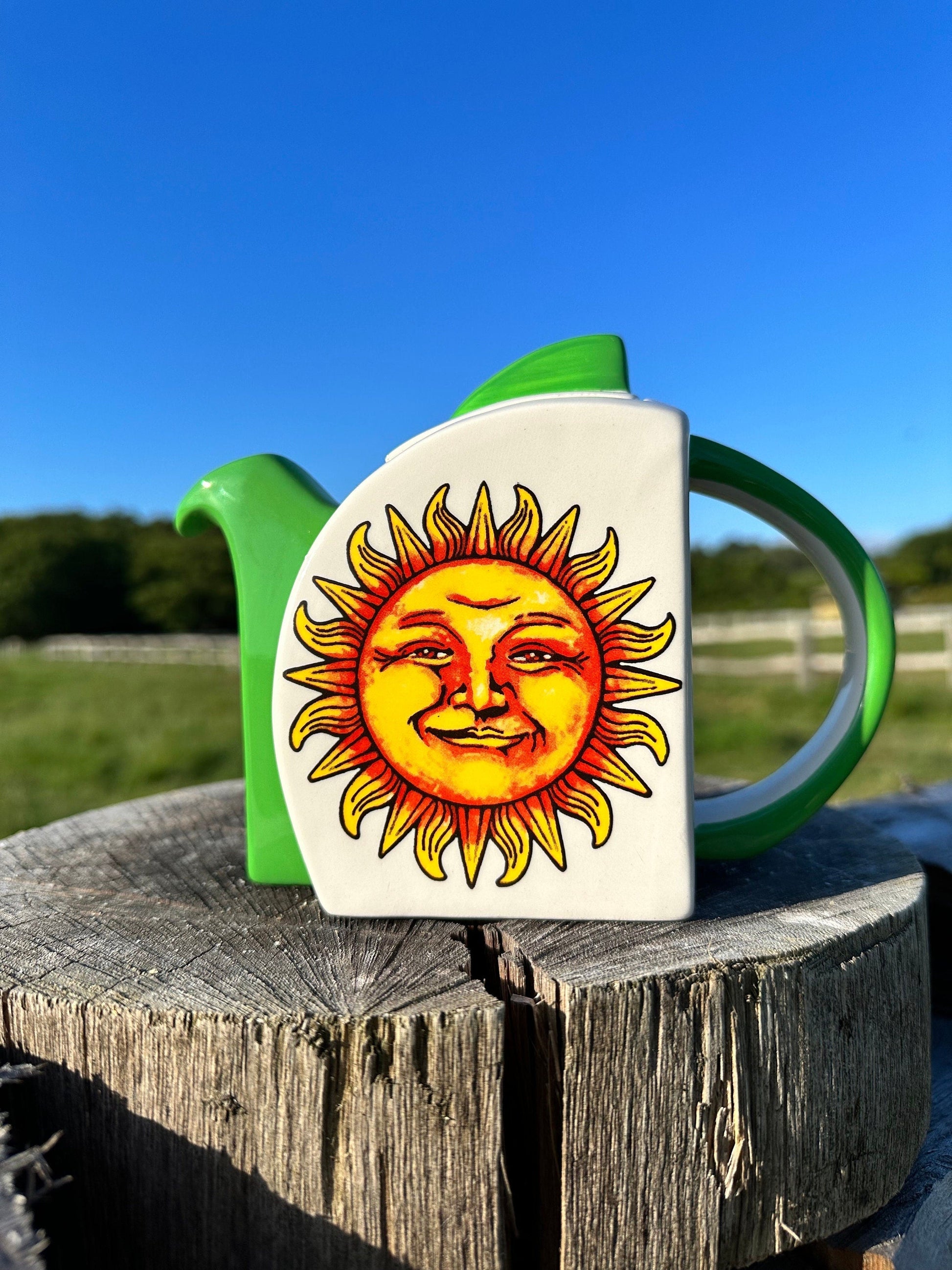 Nooromason Sunshine Face Teapot Collectible in perfect, unused condition ('new old stock'). This flat-sided ceramic teapot with a charming sun face design is an authentic original issue from the 1970s, later retailed by Clarice Cliff Gotham.