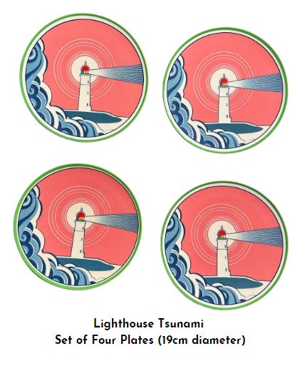 Indulge in drama with our set of four 19cm plates featuring a lighthouse against a sunlit sky and a captivating tsunami wave! Inspired by the designs of the icon herself - Clarice Cliff, this limited-time collection brings vivid colors and thrilling designs to your dining experience.